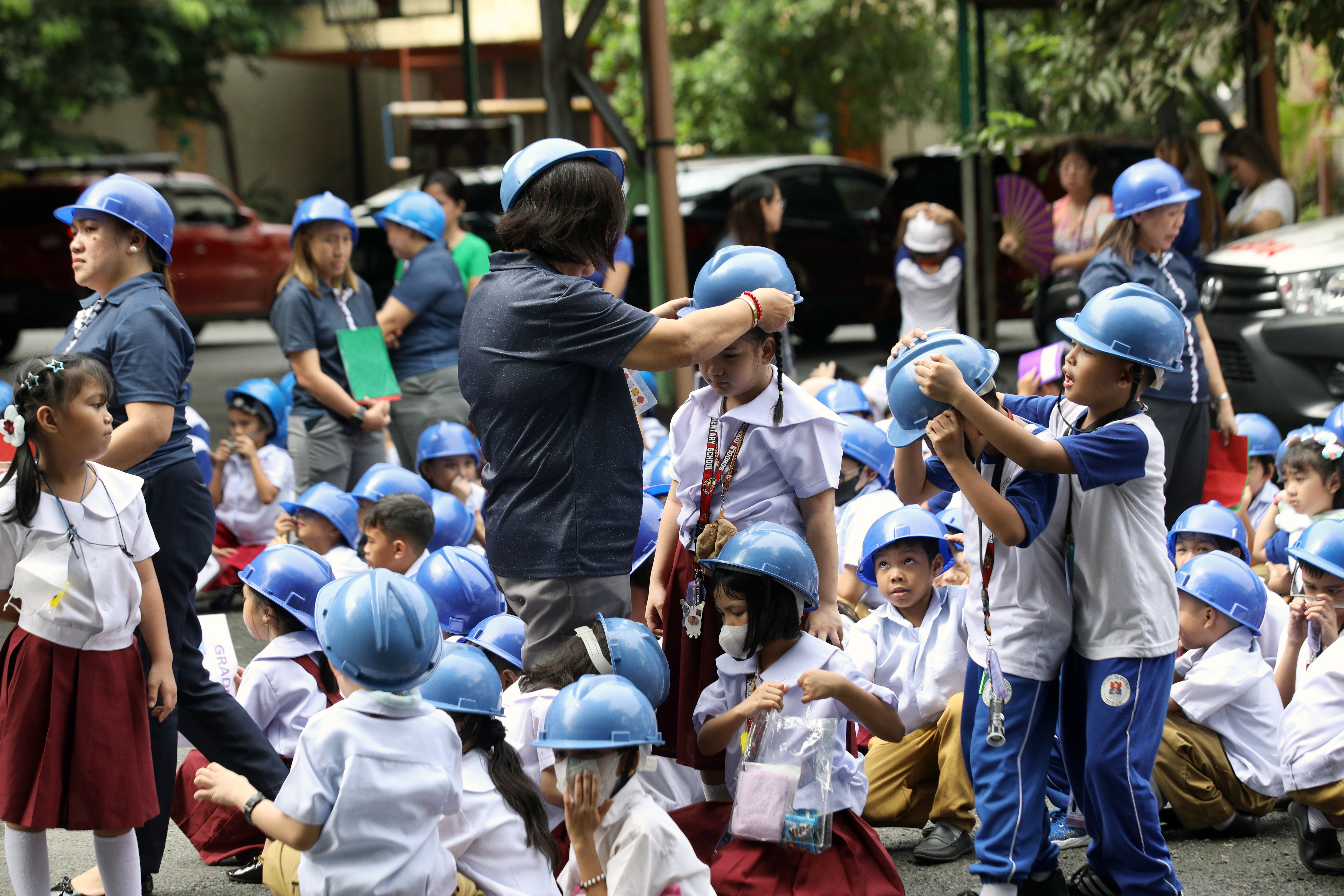 Grade school pupils of the Rafael Palma Elementary School in Manila participate in an earthquake drill and preparedness orientation on Thursday (Oct. 16, 2025). The students learned about the use of safety gear, such as hard hats, the “drop, cover, and hold” protocol, and the importance of listening to their teacher’s instructions during emergencies. (PNA photo by Yancy Lim)
