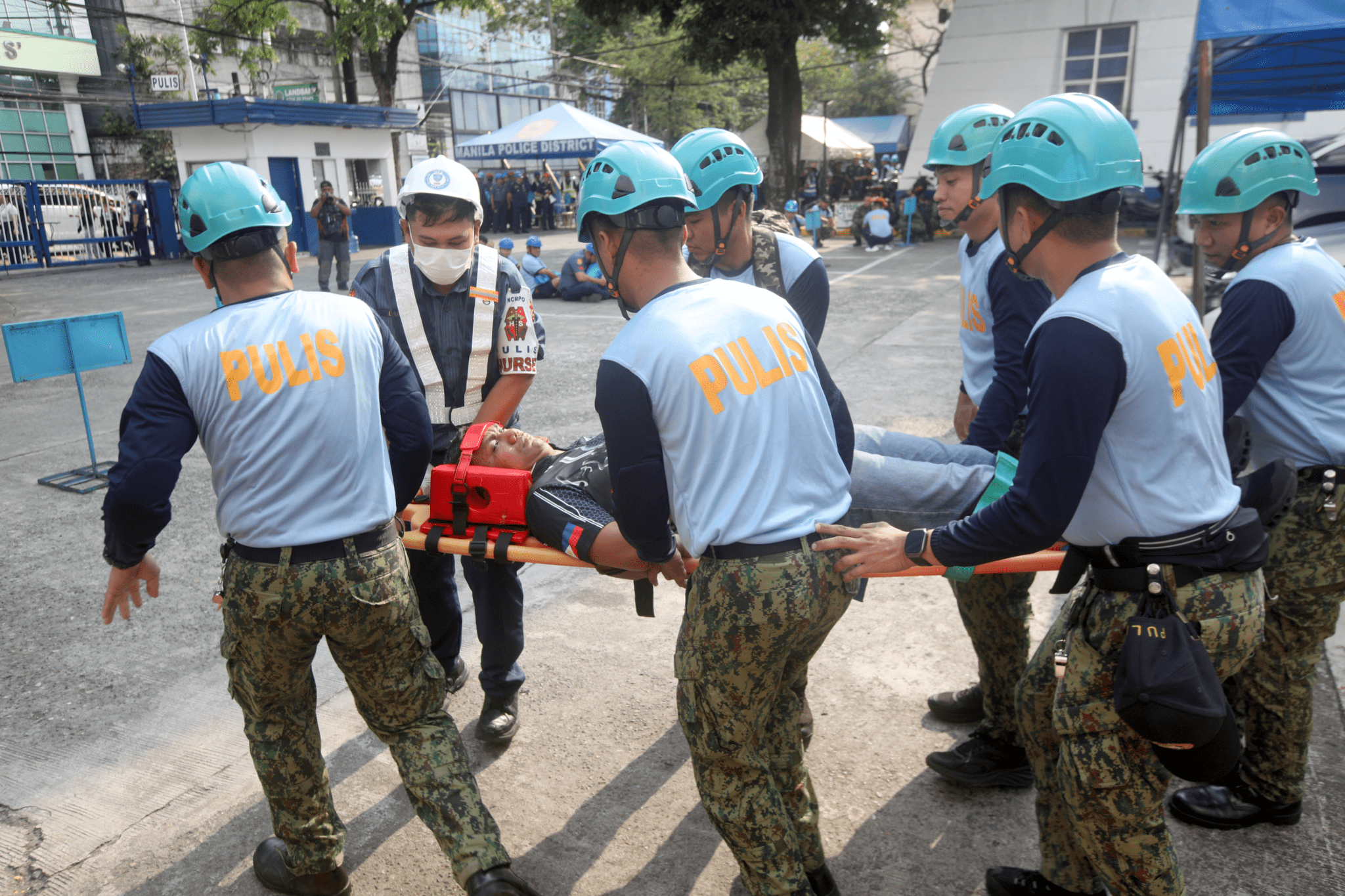 Personnel of the Manila Police District headquarters in Ermita, Manila carry an “injured” colleague during the 1st-Quarter Nationwide Simultaneous Earthquake Drill on Thursday (March 12, 2026). The quarterly drill aims to test the ability and readiness of government offices and schools in case of a major earthquake. (PNA photo by Yancy Lim)
