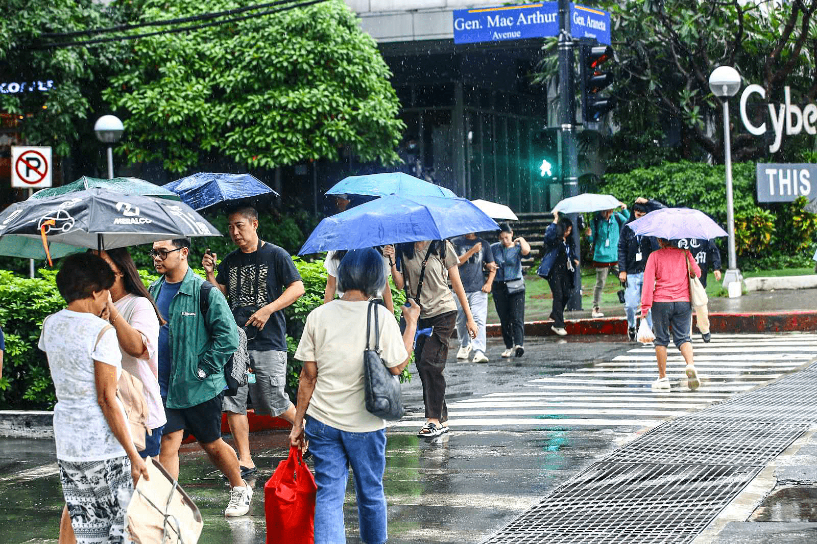 Pedestrians endure another rainy weather in Cubao, Quezon City on Friday (Oct. 3, 2025), mainly due to the effects of tropical cyclone Paolo. Downgraded from typhoon to severe tropical storm as of 2 p.m., Paolo is forecast to exit the Philippine Area of Responsibility Saturday (Oct. 4) morning. (PNA photo by Joan Bondoc)